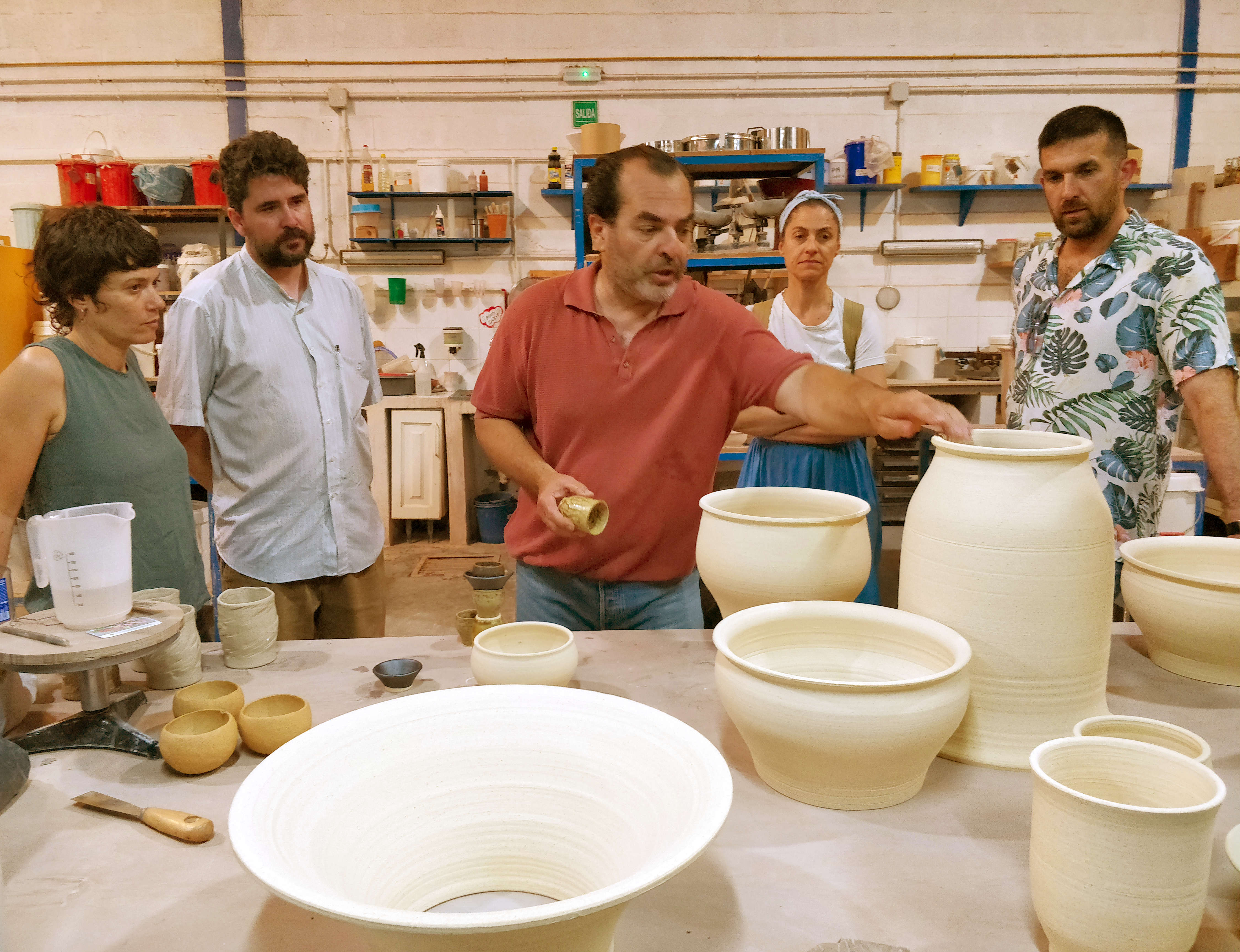 El segundo taller residencial de PALIMPSEST en Jerez se inició el lunes 23 de junio con la recepción de las nuevas piezas cerámicas creadas para el proyecto SONE. Estelle Jullian, Talita Medina y Nomad Garden se desplazaron al taller cerámico de Gresierra para recoger los primeros prototipos en formato grande todavía sin esmaltar y algunas muestras de esmaltes. Todos ellos fueron trasladados a Jerez, algunos al Palacio de Villapanés para mostrarlos al consorcio y otros al taller del luthier Coca para comenzar a probar sus sonidos como zambombas.